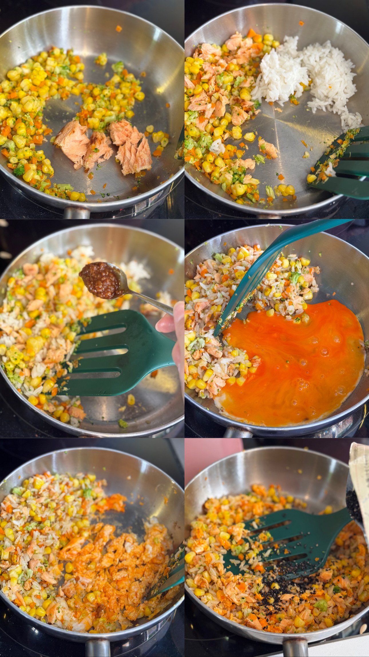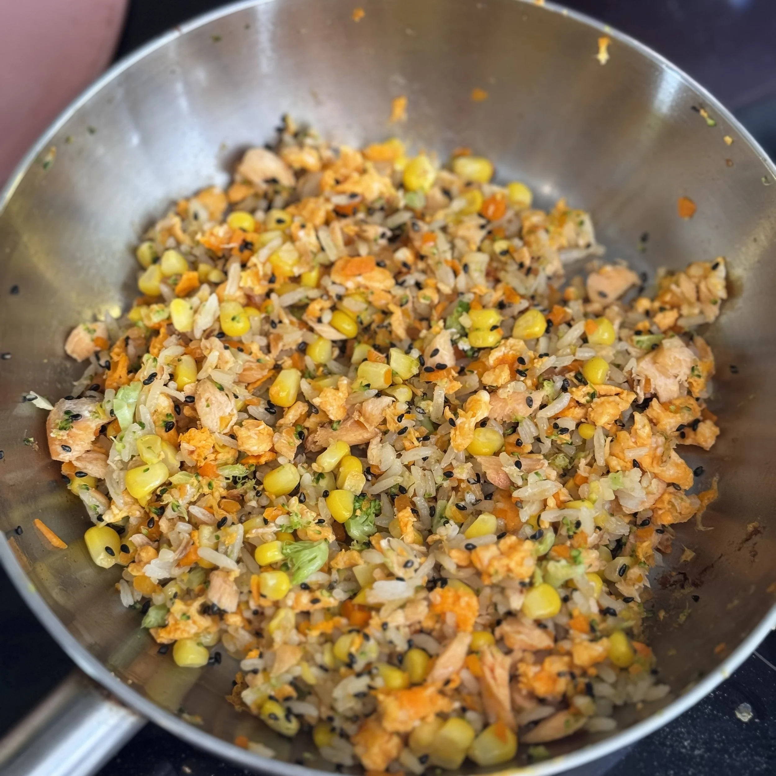A colorful and nourishing fried rice made with leftover salmon, sweet corn, broccoli, and carrot.